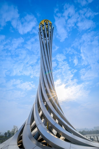 成都大运会火炬塔,在阳光下映射出彩虹!