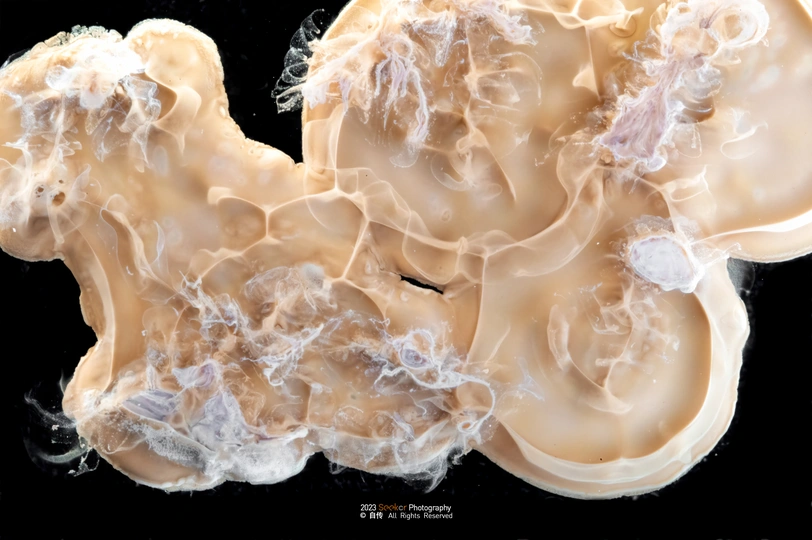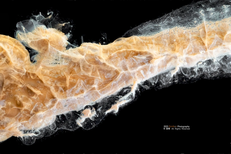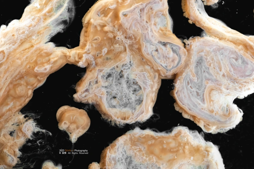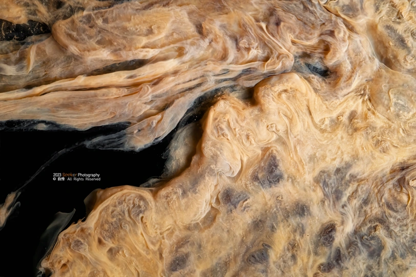 化学摄影,将台子优化了之后,进行了第二次尝试,这次选用了较为贵重的硝酸银进行试验,硝酸银在碱性条件下生成氢氧化银沉淀,而后又迅速分解生成氧化银棕色沉淀,通过多次调整溶液浓度和混合方式得到了以下四张成片,有点像木星表面 反应方程式如下:AgNO3+KOH→AgOH↓+KNO3 2AgOH→Ag2O+H2O 大千世界,化学得我心,用微距摄影反映出我眼中的微观化学世界,也是完成了我的一个心愿。 📷:Nikon z6ll+LAOWA 100mm f2.8