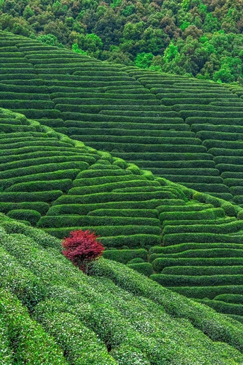 龙坞茶镇的光明寺水库龙井茶园,万绿丛中一点红。