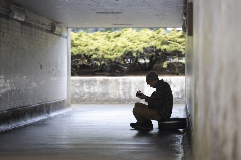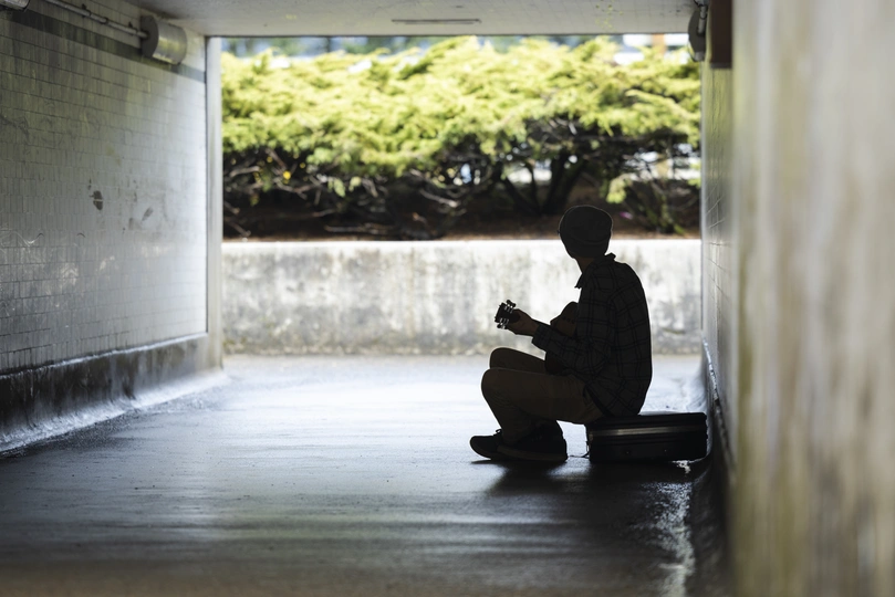 潮湿的地下道,有一个小哥哥在弹琴,抬眼看得见桥外的绿