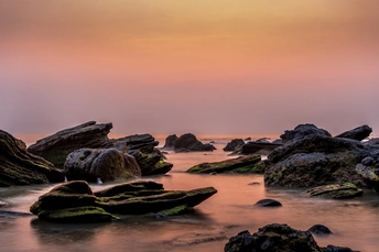 余晖下的滴水丹屏海滩礁石