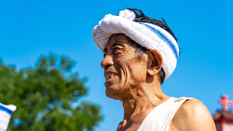 山西临汾的威风锣鼓队独有的特色,头顶缠着白色的毛巾,身穿着白色的背心