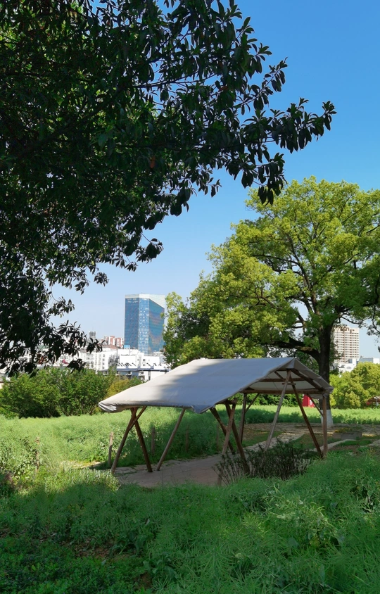 远处的高楼世界大而远,林中的小阳蓬世界小而大。人在天地间有心胸,大世界就在心中。觅一块绿地,得一刻悠闲,天地悠悠,咫尺天漄