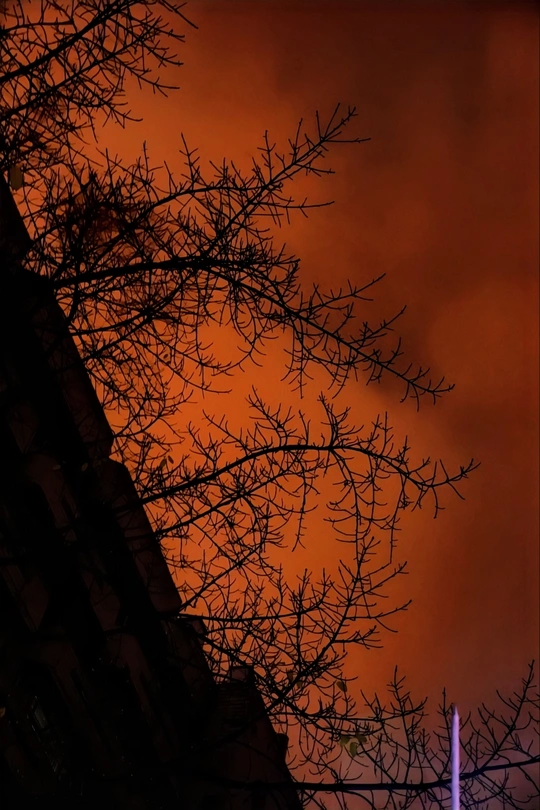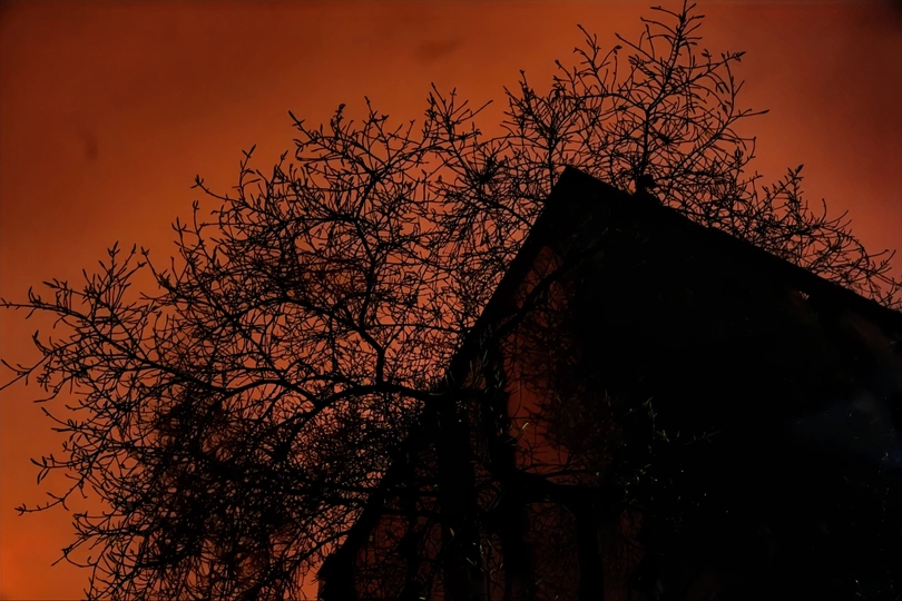 红色天空下,黑夜中的树枝在楼房间舞动。