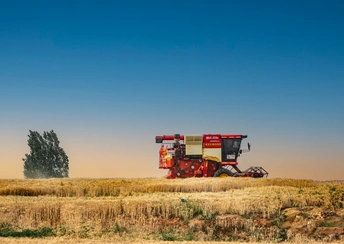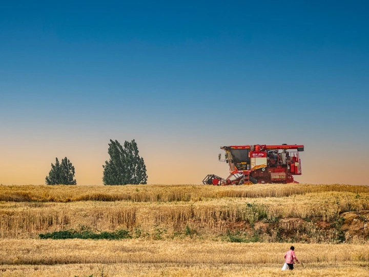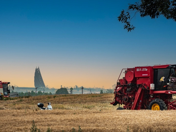 成都天府绿道边上,金色麦浪,收割机在收割小麦
