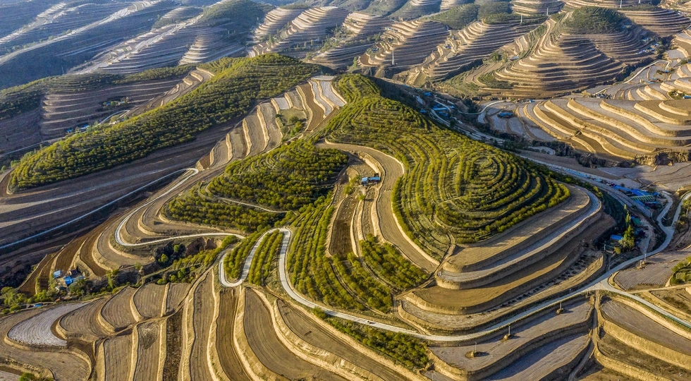静静地依偎在黄土高原腹地,一座山,从山峁到山脚依次而下,另一座山又是如此,梯田依山付型,一层层一片片,远远望去,蓝天如洗,白云如絮,梁岭起伏,梯田千层万叠,如诗如画