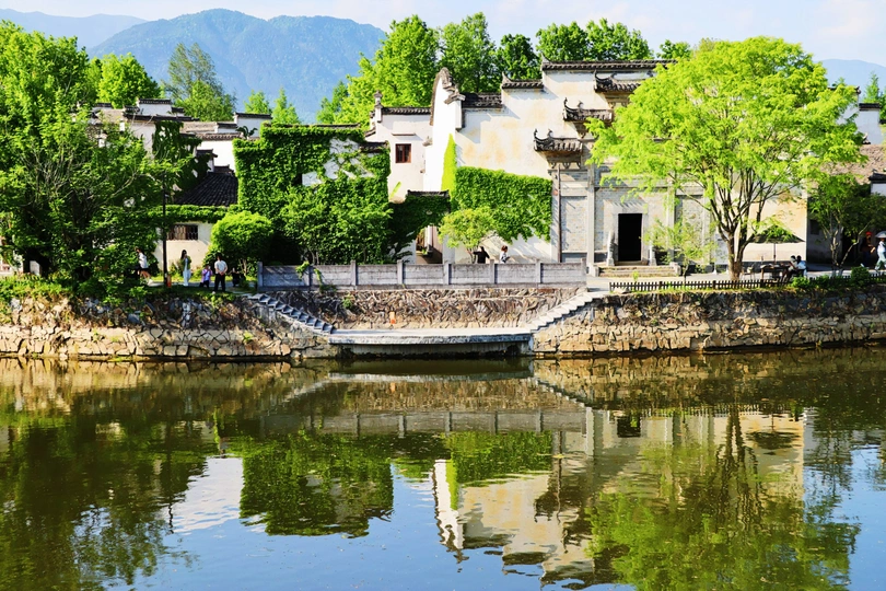 夏天即将到来之际,在安徽旅游时,参观游览秀里影视村,在河边散步时,被谁面倒影所吸引,之间白墙黑瓦与绿树蓝天倒影在水面之上,形成一幅优美的图画
