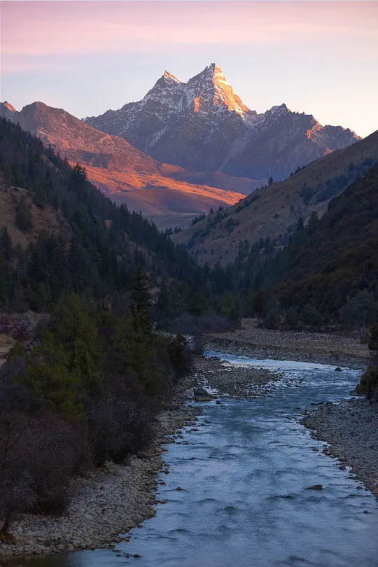 潺潺小溪从雪山出发,跋涉在茫茫高原,溪畔是遍地丛生的灌木和野草。面对那一座座高耸入云的凛冽雪山,小溪显得温婉柔弱。山涧的小溪转了个弯,哗啦啦的流水冲涮着或圆或扁状的卵石一路唱着轻快的歌儿,奔流而下,在石上不时击起的水花,象一朵刚绽开的花蕊,一眨眼却又不见了。
