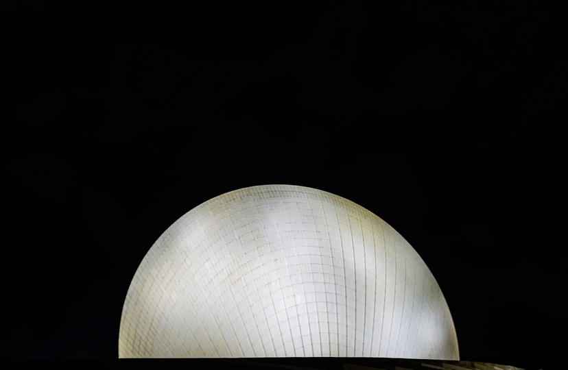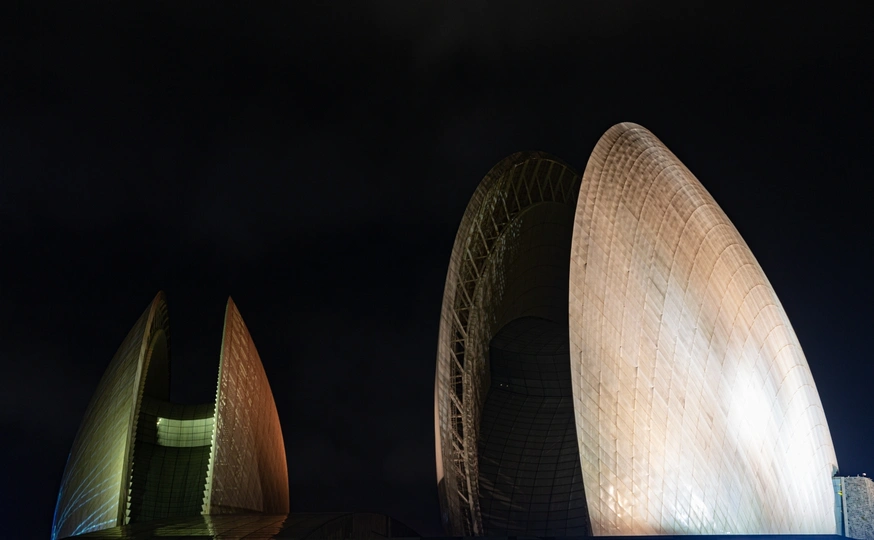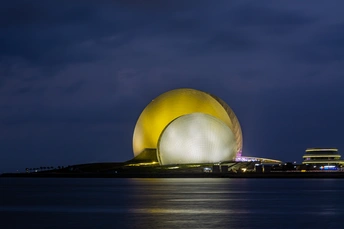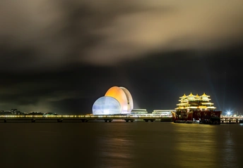 和家人去珠海旅游,拍下灯光下的标志性建筑物日月贝
