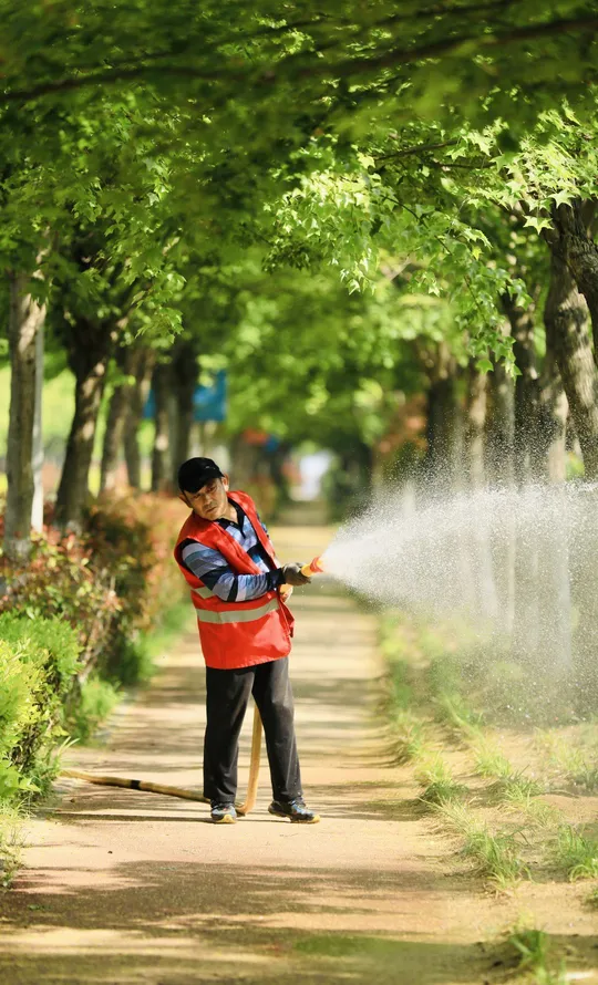 在初夏时分,园林工人仔细的浇灌路边的绿化花木,水迎着下午的阳光,所及之处,是我们工人的有心之作。今日点滴灌溉,明日苍翠一片片。