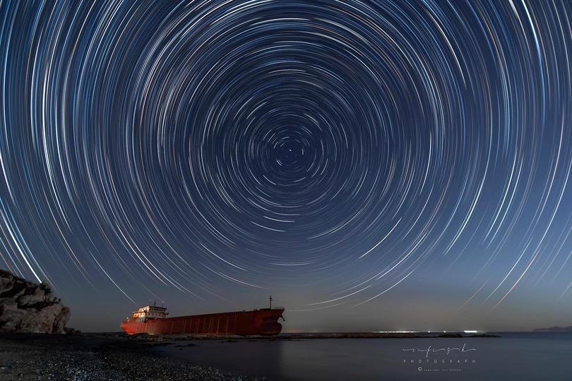 搁浅于旅顺口区小黑石的货轮,多年风吹海浊下,成了海岸独特的风景,夜幕星空下,仿若来自天外的来客