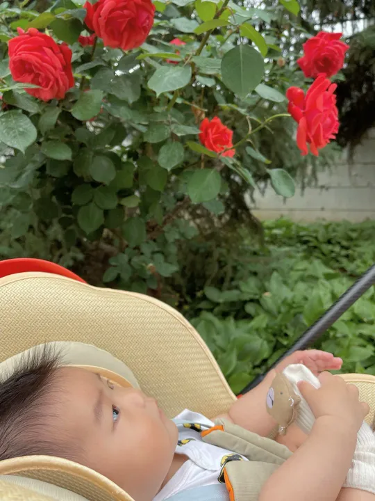 月季花盛开时遛娃,娃被花吸引住了。瞧那全神贯注的眼睛。爱美之心人皆有之。