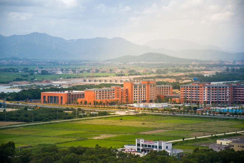 远处看一所在郊区的学校红色外墙和绿色的背景形成对比