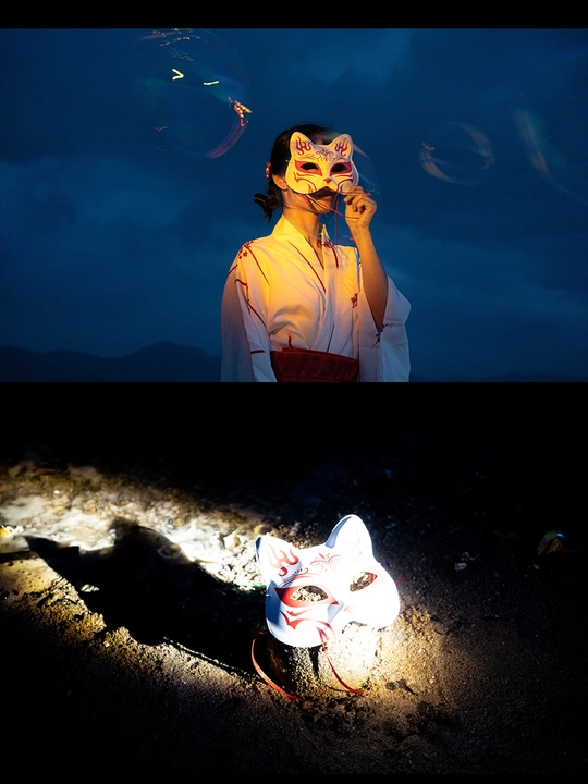 《梦.幻》 月盈旷野,灵狐降世。 幻化人形,为女子状。 涉足人类社会,似人而妖。 既喜既悲,忽云又雨。 却觉人间疾苦万千,未若梦境旖旎。 故是幻境破灭,茫然自失。 拾降世之魃,归本体魂魄。 人间已无御前稻荷, 世人只传滩涂发现一具狐面… 这组作品灵感来源于神级导演黑泽明的《梦》第一节”太阳雨和狐狸娶亲“,但我们发挥想象,结合当地场地,拍了自己想拍的东西