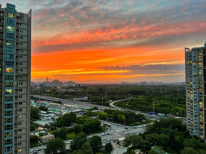 正要拉上窗帘时,突然瞥见窗外的旖旎晚霞。