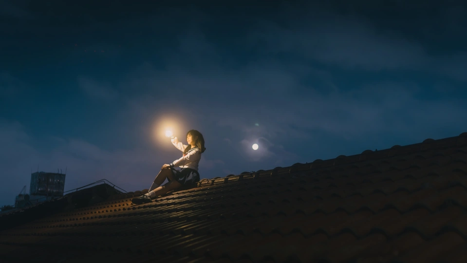 好不容易又等到一个夏天,再加上好不容易找到的一个楼顶,此时此刻望着远方的月亮,叫上模特与它来一张合影吧。