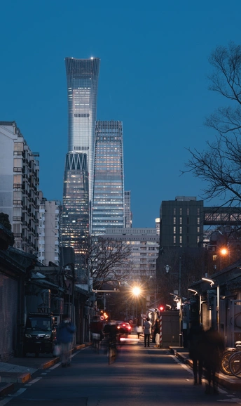 夜晚漫步其间,抬头远眺北京繁华中国尊地标 全长723米, 见证老北京大都市600年变迁。 拍摄使用的镜头是70-200,拍摄建议夜晚蓝调时刻。