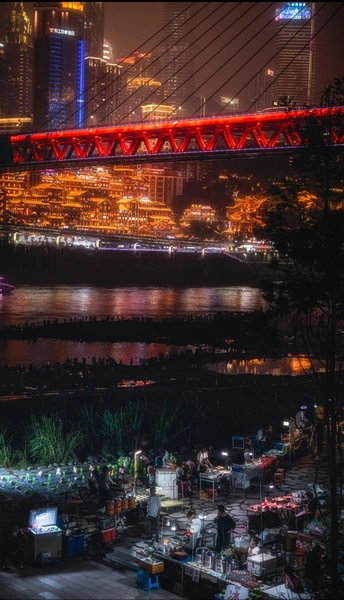 一张封神系列 | 山城江滩真是太好拍了—— 近处的小摊贩和远处的洪崖洞强烈的视觉反差,肉眼看都特别震撼 设备:a7m4+Sigma 100-400mm F5.6 @米拍社长 @米拍
