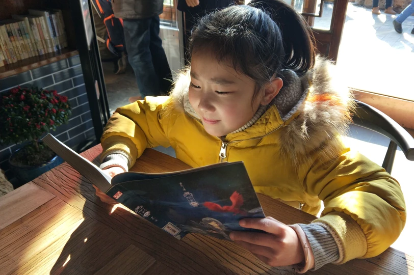 这位渔村小姑娘正在新建的村办书屋里阅览儿童图书。拍摄于江苏省扬州市邗江区沿湖村渔家书屋。
