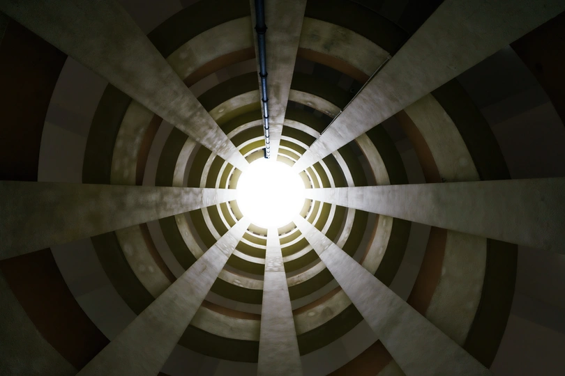 该照片摄于香港某停车场,自下而上的视角好像是在一口深井里仰视太阳的光芒,烛照作为太阳神兽也寓意着光明,光芒透过八卦阵一样的螺旋打下来,就像给在黑暗中的人们带来生的希望