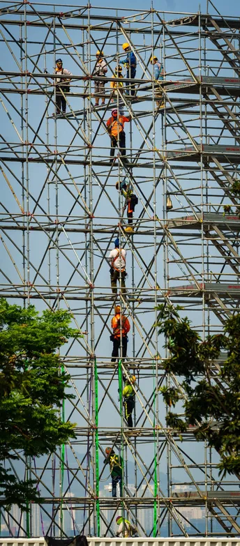该照片抓拍于中环建造演唱会场地的时候,工人们在这一刻聚集在同一条线上,上面人多,形似树冠下面整齐排布着一列人,形似树干,工人们用自己的身躯在这座魔幻城市里建造着钢铁森林,可他们可能也不知道,自己也是森林中树的一部分