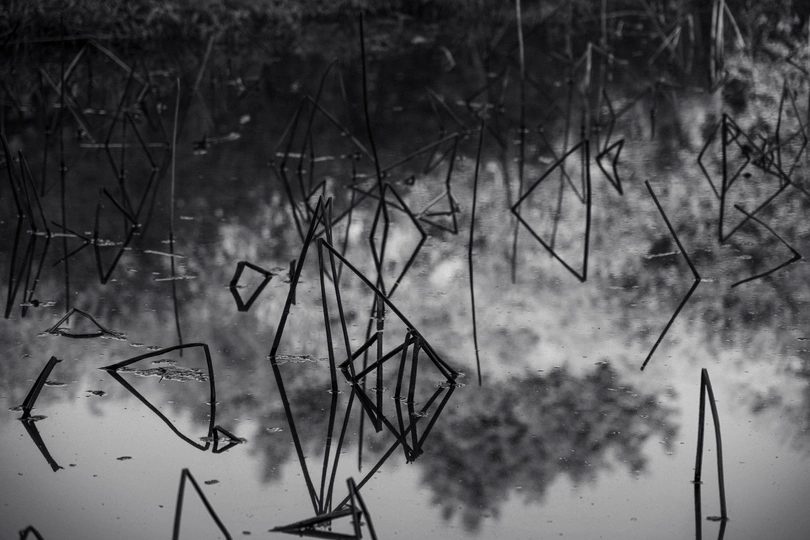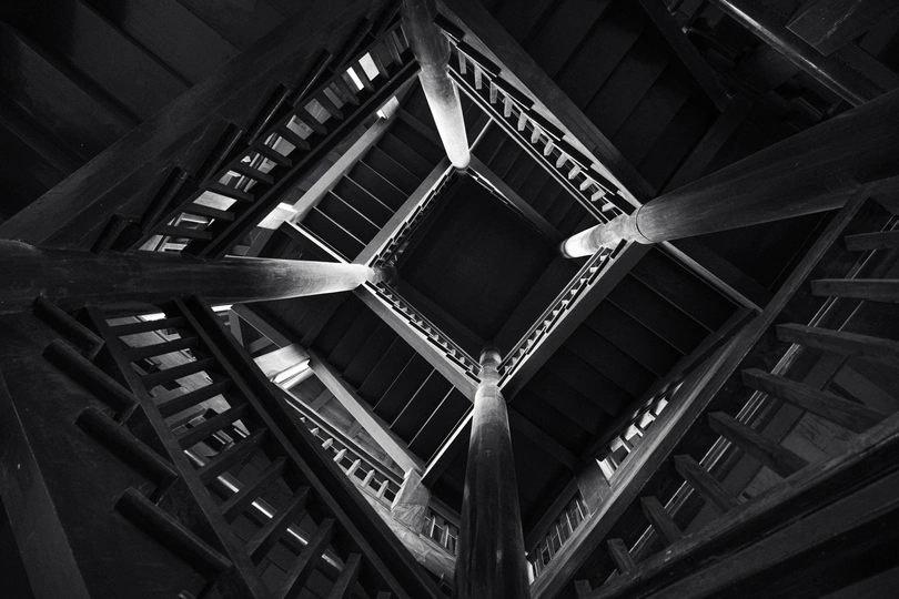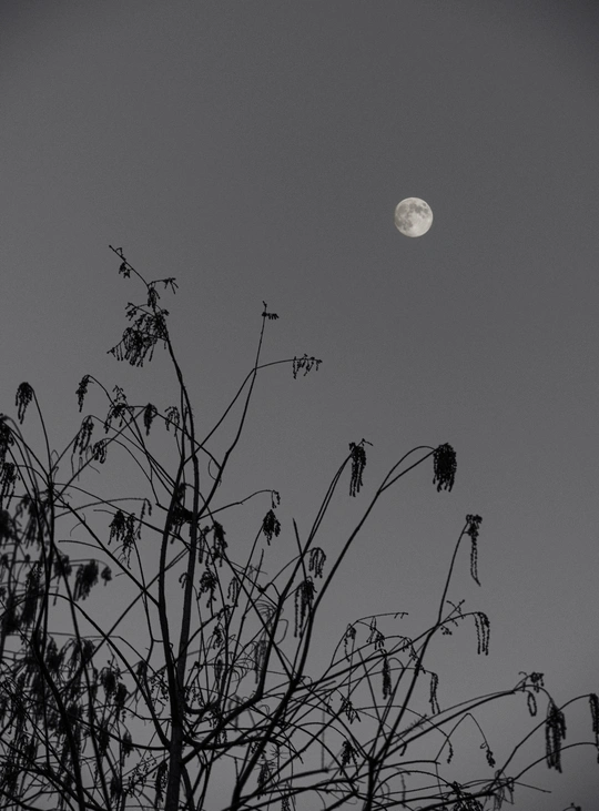 水面上反射出不规则的倒影,月色下枯萎的柳树,还有方向旋转向上的楼梯,配上黑白色的影调,似乎失去色彩生活就变得黯淡无光了。