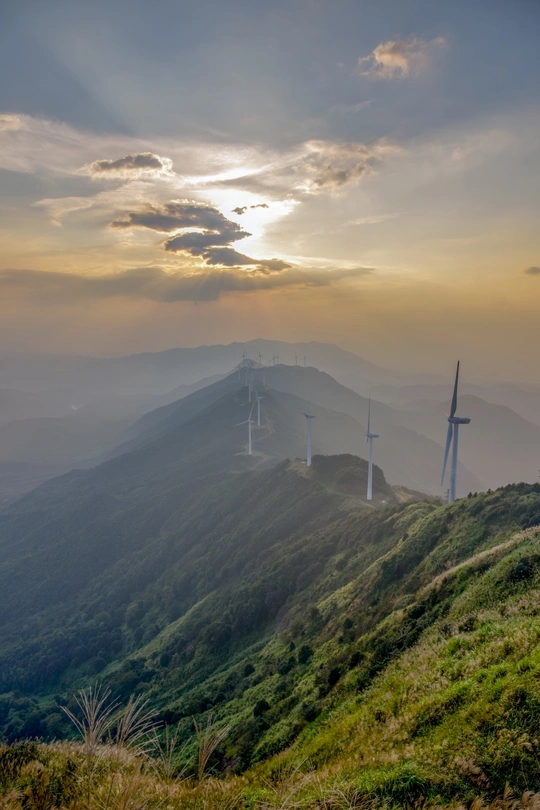 日落时分,在广东省河源市缺牙山拍照时,远方的太阳在云层中若隐若现,从云层中穿透出的光照射着大地充满激情。山顶上的风力发电机,一字排开,雄伟壮观。大自然云层遮阳的神奇自然景观与人类利用风力在高山顶上发电智慧结晶的风机,同时出现在一个画面中,相互辉映,形成一幅新时代自然与人类发展的