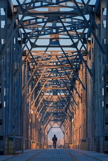 百年历史的松花江铁路大桥,曾经火车通行的铁轨,两侧都铺上了玻璃和瓷砖,现在既是文物,也是人行桥梁,旁边就是正在运行的哈齐高铁,松花江冰面的寒风和高铁路过铁轨的声音,遥远地提醒着这里曾经有火车路过现在人行的桥面。 日出时分的冬日阳光,从侧面穿过桥梁密集的钢结构,光影斑驳,没有平时密集的游客站满桥面,只有零星的当地行人过桥,降低机位用长焦最远端抓拍,强烈的透视和现场的线条框架,得出的画面非常舒服