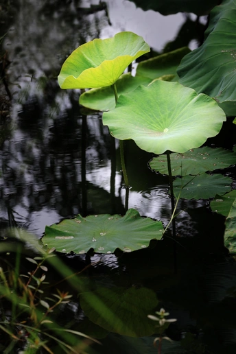 走着、走着,忘记来时的路,被眼前的荷叶吸引,手中相机也不自觉地拍下阳光下的荷叶。 正午阳光炽热,洒落到水面、荷叶的阳光却是那么温柔,挡住烈日的柳树倒映水中,好奇的小鱼探头伸出水面,打破了镜面,划出细细、纹纹的圆圈。明暗对比荷叶也竟是那般绿中带翠,让我明白纯色、纯洁本是同源。
