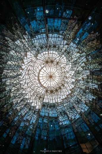 太阳照耀下,玻璃与玻璃之间的倒影形成一个万花筒。
