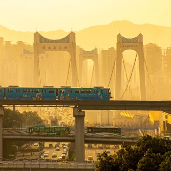 清晨,当太阳缓缓升起,轻轨,公交,出租等各种交通工具穿梭在城市当中。鹅公岩大桥沐浴在第一缕阳光下,