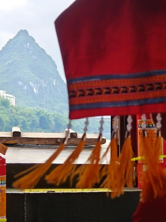 照片拍摄于广西宜州,我坐在游船上,佩戴壮族特色头饰的解说员示范刘三姐唱山歌的桥段,徐徐微风正好吹起她的头饰,这一瞬间让我忍不住用OPPO FIND X6PRO记录了下来,回到北京,虽然已经离宜州很远,但是此景仍是鲜活的,近的。