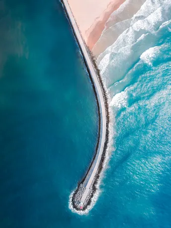拍摄于海南万宁神州半岛,通往灯塔的弧形沿海护堤一直延伸至大海,护堤东边浪潮汹涌,在清晨阳光照耀下波光粼粼,西边由于海浪被护堤遮挡,呈现平静的景象,用航拍视角记录下大海被护堤“一分为二”的画面。