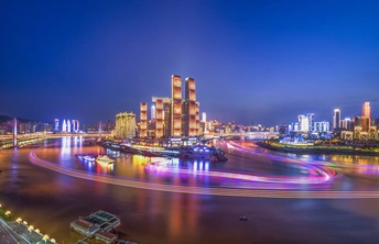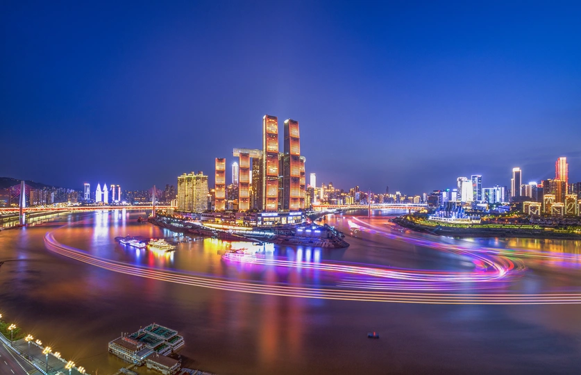拍摄于阳光100楼上,夜幕初降,通过长时间的曝光加广角镜头,记录下两江交汇处游船的行动轨迹,以及华灯初上的璀璨夜景。千厮门大桥、东水门大桥、大剧院、朝天门尽收眼底。