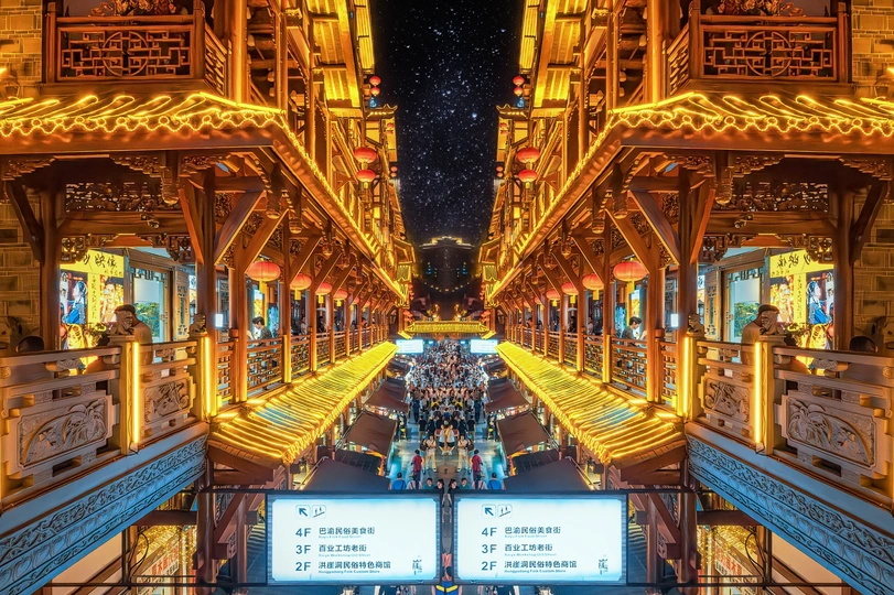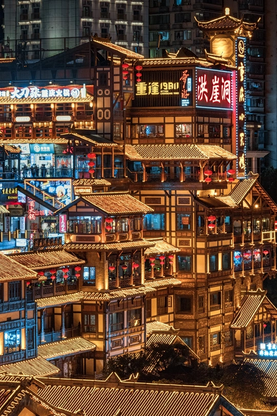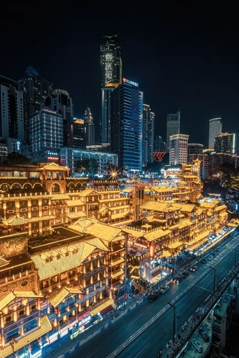 洪崖洞,原名洪崖门,是古重庆城门之一,位于重庆市渝中区嘉陵江滨江路88号,2003年,总投资3.85亿元对洪崖洞片区进行旧城拆迁改造,于2006年9月竣工开业,是兼具观光旅游、休闲度假等功能的旅游区 。 洪崖洞是重庆市重点景观工程,建筑面积4.6万平方米,主要景点由吊脚楼、仿古商业街等景观组成 。洪崖洞一共有11层,夜晚灯光从晚上6点开灯,10点熄灯。可望吊脚群楼观洪崖滴翠,逛山城老街赏巴渝文化,烫山城火锅看两江汇流,品天下美食。形成了“一态、三绝、四街、八景”的经营形态,体现了巴渝文化休闲业态 。 2007年11月,重庆洪崖洞民俗风貌区被评定为国家AAAA级旅游景区 。2020年11月18日,洪崖洞被列入“成渝十大文旅新地标” 。2021年12月,洪崖洞被列入“重庆市第二批历史地名保护名录” 。 @米拍活动呆呆兽 @米拍 @米拍社长 @米拍编少