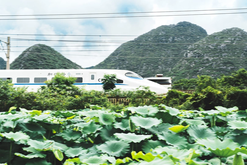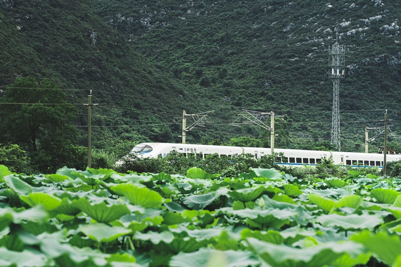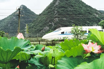在桂林有这样一个地方,前景时荷花,中间有穿梭而过的高铁,背后是奇峰林立的桂林山水