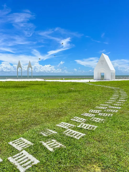 网红打卡地,拾贝公园。在海边,蓝天白云下的白色建筑,还有绿草地。这应是夏天的色彩吧。
