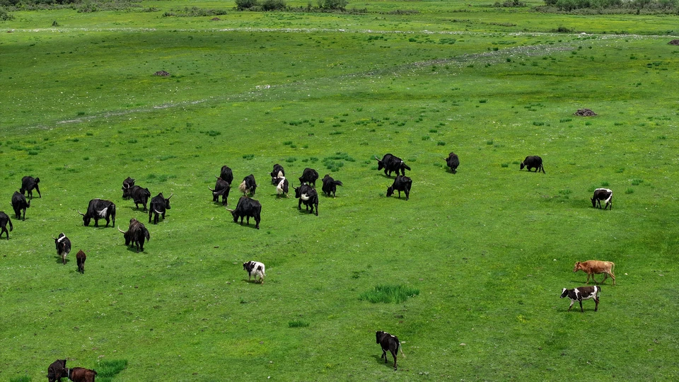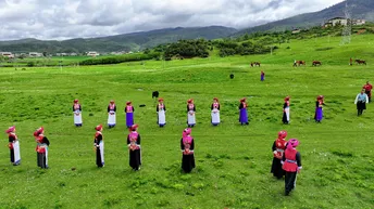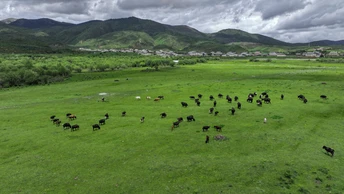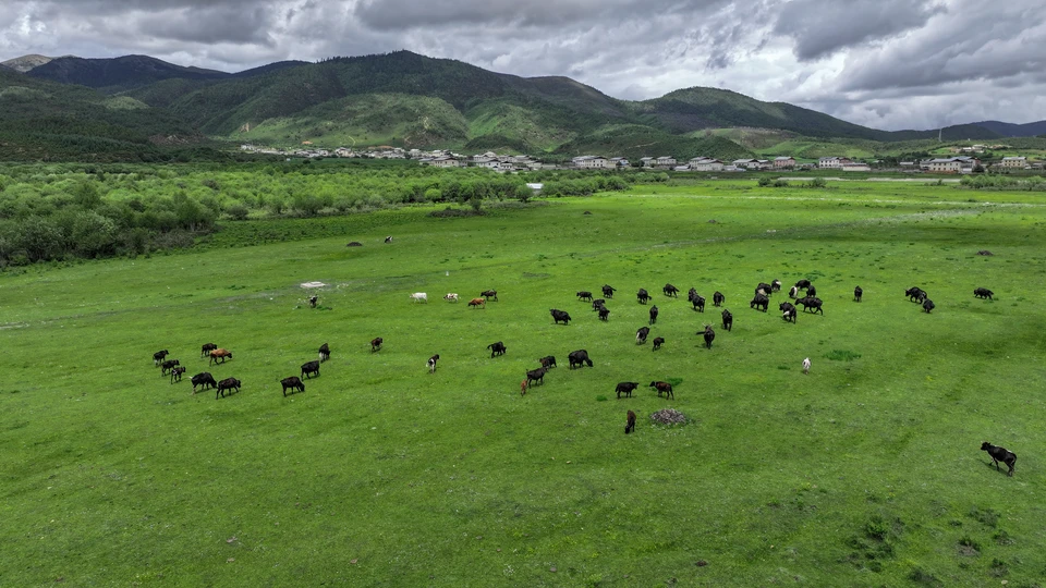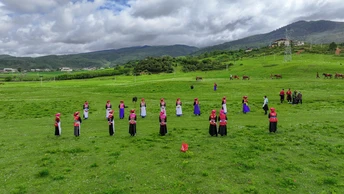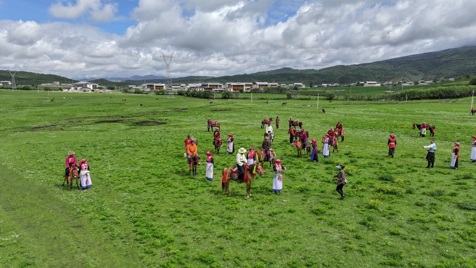 香格里拉赶往赛马节的村名和骑手,在村落边正在彩排赛马活动前的节目