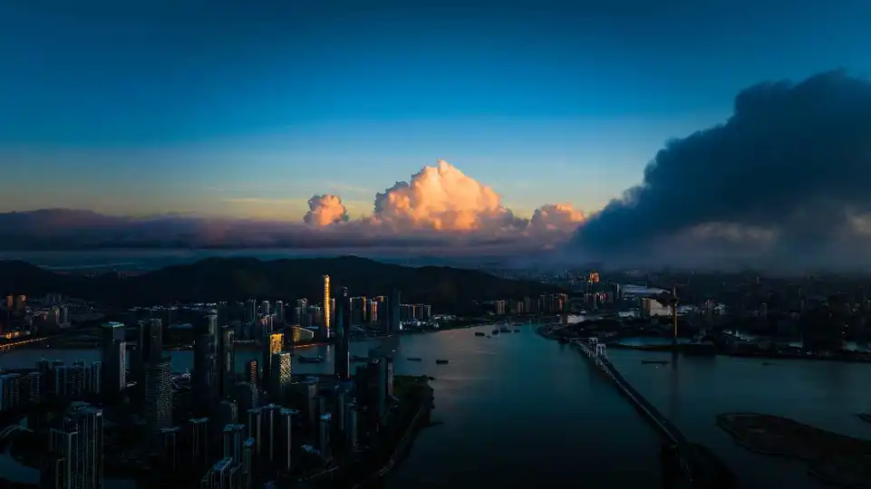 云山雾绕 城市之巅 御3pro 清晨天空中一朵云静静地飘过,像是一座雪山,在早晨的城市上空矗立。 它那么真实,又那么虚幻,仿佛是自然界的精灵,神秘又美丽。 #mavic3pro #macau #sunrise #御3pro #日出