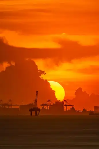 深圳海边,眺望到广州南沙港。金色日落充满着浪漫与震撼