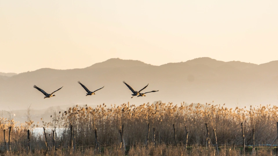 来自贵州省毕节市威宁草海自然保护区的夕阳黑颈鹤