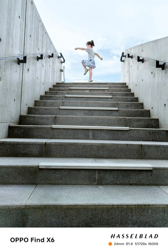 运动模式抓拍到孩子顺拐的可爱瞬间,两边楼梯非对称和台阶很好的引导视觉,云端上的孩子自然而然成了焦点!