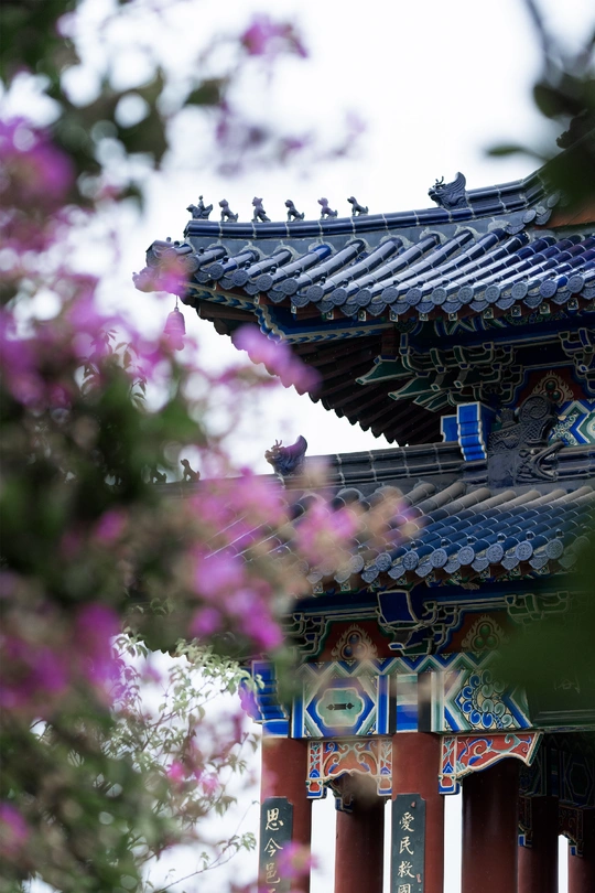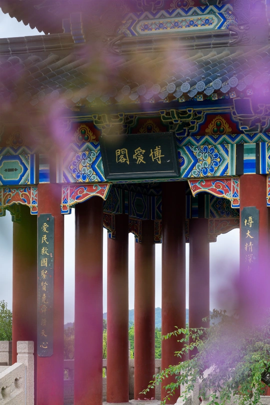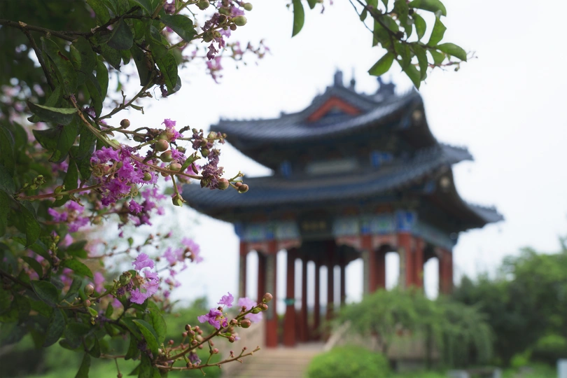 夏日梅花山 紫薇映衬着博爱阁、格外美丽
