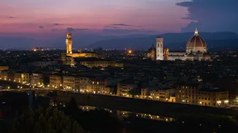 在米开朗基罗广场上远看佛罗伦萨古城,中世纪古堡在蓝调时刻的映衬下显得格外美丽。