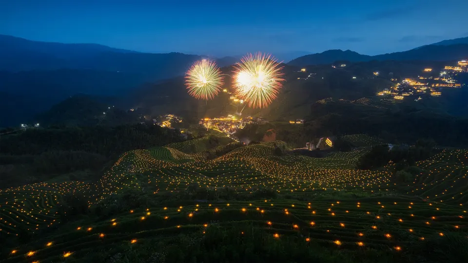 一年一度的龙脊晒衣节在农历六月六举办,届时会有很多民俗活动,为了祈求新的一年能丰收,旁晚会在梯田里插满蜡烛,再放烟花庆祝这欢快的节日气氛,我最近几年都在跟拍这个活动,常规机位已经不满足我的拍摄需求,我在田里寻找合适的拍摄点位,站在两脚宽的田埂上拍摄了这幅作品,左下角的倒影烟花也是无意间拍摄到的,很喜欢这种不确定性,给画面增添了一些色彩以及画面平衡。