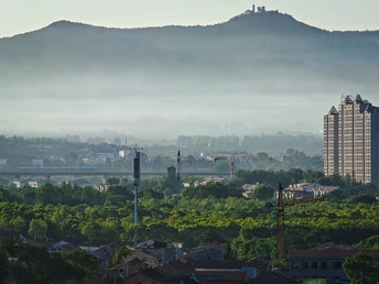 窗外朦胧的薄雾与山、村庄、城市、树木交织,带来无比震撼的视觉体验。 村庄随着城市建设的步伐快速改变,一座座塔式起重机仿佛预示着整个村庄的未来。