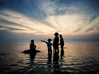 暮色之光的湖畔,抓拍到一家人在浅水处嬉戏,小朋友指着东方快看那……