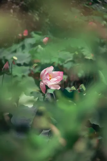 夏日成片的荷花盛开,点缀了山谷的容颜