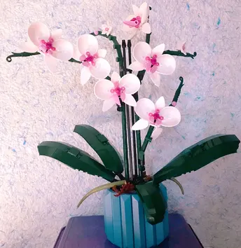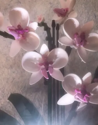 一束花,其中包括粉色和白色的兰花,放置在一个花瓶里。花朵被放在白色或黑色的塑料框架上,周围是光线的反射。这个场景给人以美丽、优雅的感觉,因为花卉与光线和谐共生。
