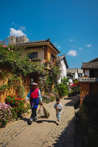这是一张以大理喜洲古镇巷道生活为题材的照片。画面中,一位白族老妇人手持扫帚,带着一个稚气未脱的孩童走过窄巷,路边一户户院门前洋溢着灿烂的鲜花,为宁静的巷道景观增添了亮丽的生机。这惬意的生活场景散发着古镇民居的烟火气。朴实无华的巷道里,一老一少走过的身影印证了这座古镇久经沧桑而依然生生不息的生命力。